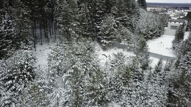 Холодный зимний пейзаж со снегом покрытым хвойным лесом. Клип. Бетонный забор и небольшое промышленное здание среди деревьев