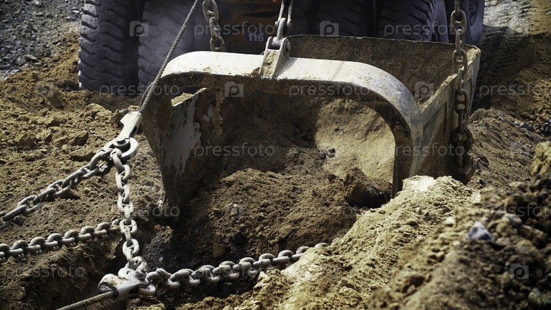 Подробный вид на экскаваторе, активно копающегося в песчаной почве, подчеркивая интенсивные тяжелые строительные работы