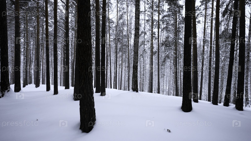Красивый пейзаж со снежно-белым лесом В зимний морозный день. СМИ. Удивительный живописный вид на сосновые леса