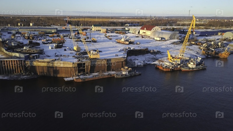 Вид с воздуха контейнерного терминала в морском порту с грузовыми кораблями, эксплуатацией кранов и оборудования