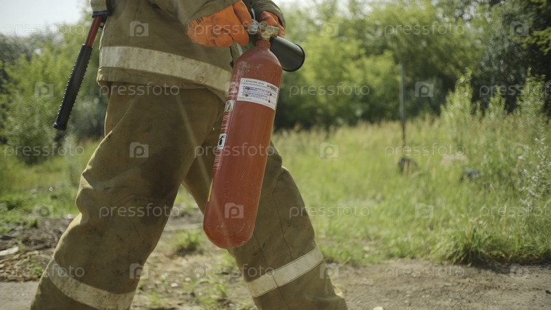 Пожарный с огнетушителем гуляет по лесу. клип. пожарная эпопея идет с огнетушителем на поле. ближайший снимок пожарного, несущего огнетушитель в поле в солнечный летний день