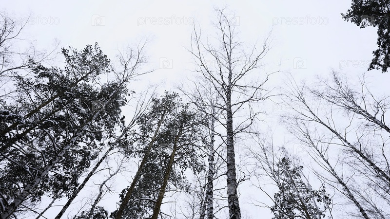 Стволы и вершины высоких сосен в зимнем снежном лесу на фоне облачного неба. СМИ. Вид снизу вверх в пасмурный ветреный день