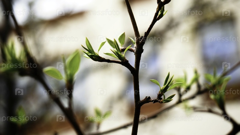 Ближайшее изображение зеленых листьев молодых деревьев в весенний день.Сток кадры.Ветви деревьев на размытом фоне здания