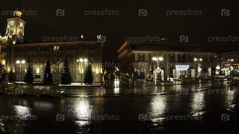 Живая городская площадь, освещенная ночью, с отражениями на мокрой тротуаре и праздничным декоре