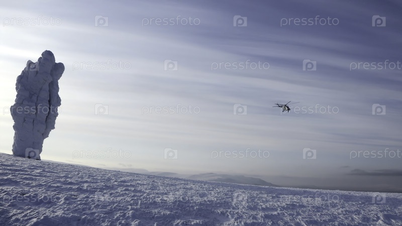 Вертолет, летящий над снежным лесом на синем фоне