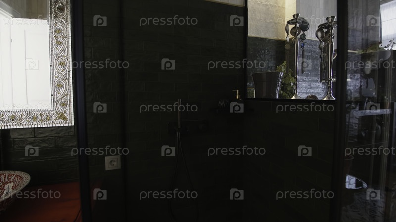 Интериорные детали современной ванной комнаты.Креативный.Прекрасные стильные детали в интерьере ванной комнаты.Дорогой интерьер бани с современным дизайном
