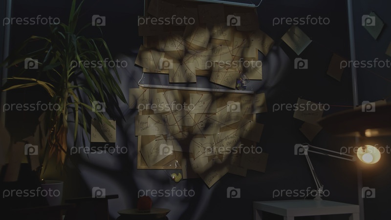 Доски с записями и нитками. Скриншоты. Доски с таинственными записками и нитями. Записки и нитки в темном офисе