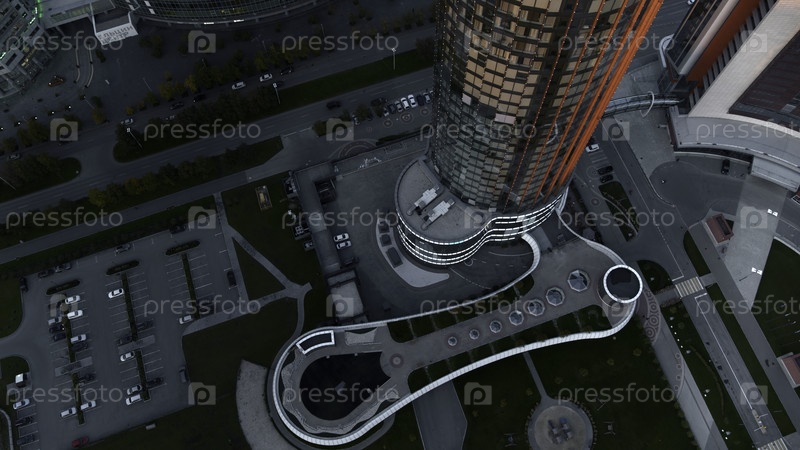 Вид с воздуха небоскреба со стеклянным фасадом круглой формы. Фотосъемки. Красивый центр города с красивой улицей
