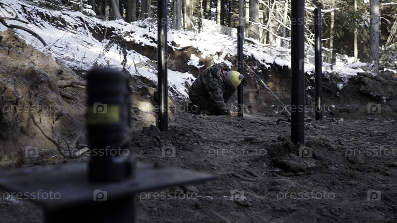 Процесс укрепления почвы с помощью свай на строительной площадке. Клип. Работник на работах по усилению грунтов