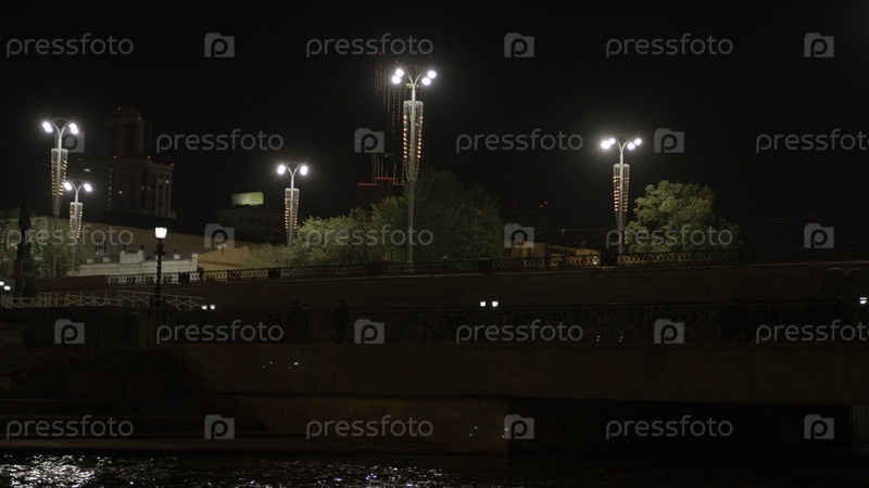 Вечерний город. Стоковые кадры. Темный вид города с рекой, над которой есть мост со дорогой для туристов и новыми зданиями, окруженными фонарями