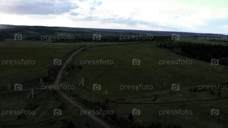 Вид с воздуха на сельскую дорогу посреди зеленых бесконечных лугов. Клип. Вид сверху поля и узкой дороги с движущейся машиной
