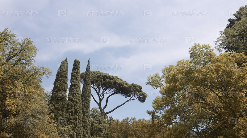 Прекрасный вид на вершины деревьев осенью. Действие. Различные формы деревьев с осенними листьями. Красивые вершины деревьев на фоне синего осеннего неба