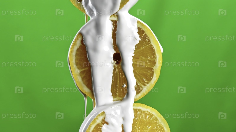 Растопленное ванильное мороженое, текущее вниз и покрывающее половины свежерезанных апельсинов. Клип из запасов. Фрукты изолированы на зеленом фоне хрома-ключа