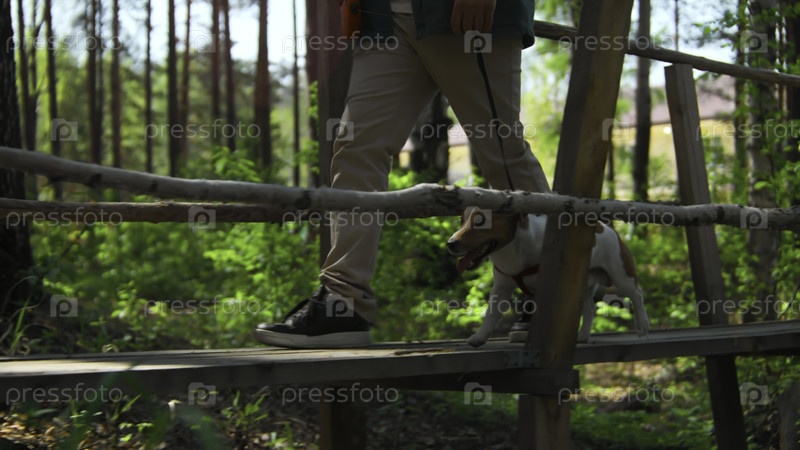 Собака и мужчина прогуливаются по мосту в лесу.Стоковое изображение.Собака и хозяин гуляют по лесу с мостом.Мужчина и собака пересекают деревянный мост в солнечном летнем лесу