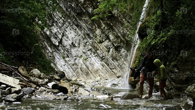 Мать и сын пересекают горный холодный ручей с камнями