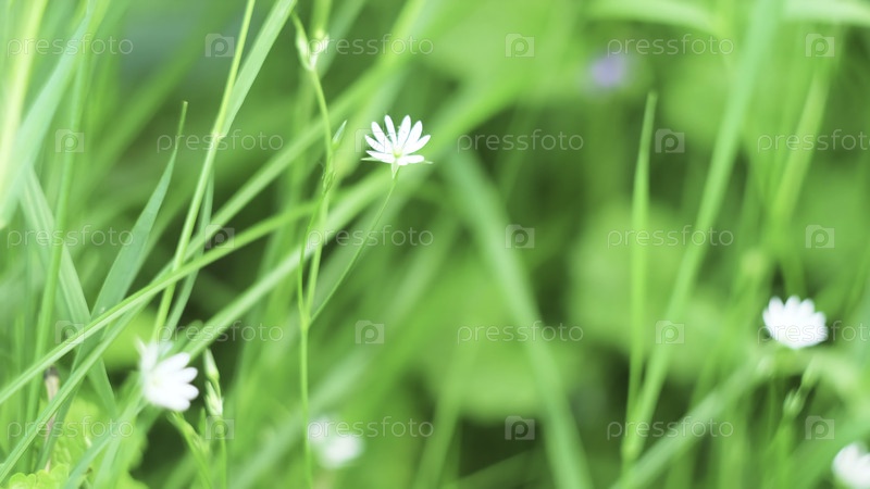 Белый дикий цветок в зеленой траве.Концепция.Белый цветок качается на ветре летом.Беленый цветок движется по траве