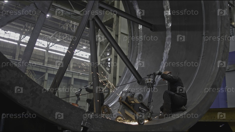 Работник с шлифовальной машиной на промышленную конструкцию. Скотч-клип. Рабочий со ленточной шлифовальной машинкой на металлическую структуру. Работник измельчает большую часть с помощью машины на металлообрабатывающем заводе
