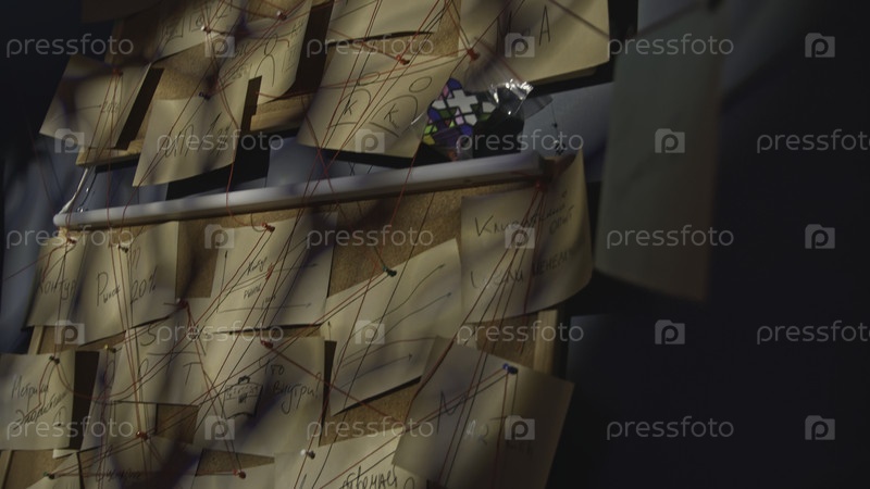 Таинственные заметки с нитями. Скриншоты. Доска со записями и красными нитками в таинственном офисе. Загадка головоломок на борту с заметками и нитями