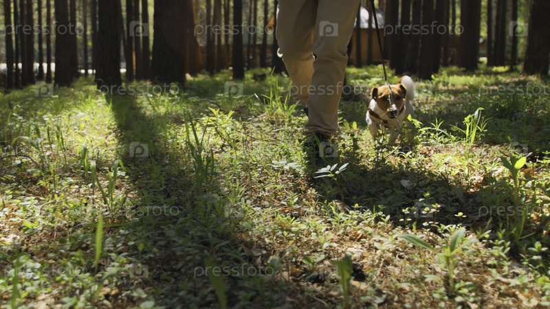 Мужчина гуляет с собакой на поводке в лесу.Стоковые кадры.Мужчина выгуливает собаку, которая ест траву в лесу.Собака ест траву во время прогулки по лесу в солнечный летний день
