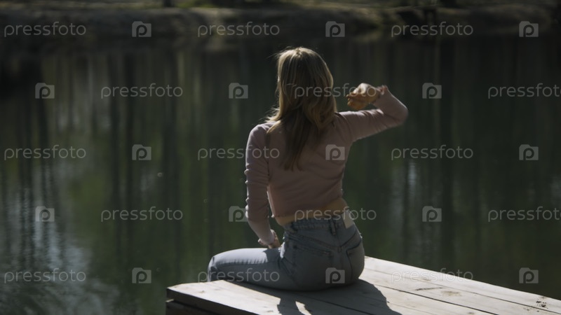 Красивая молодая женщина бросает хлеб в озеро. Фотосъемки. Привлекательная женщина сидит на пирсе и выбрасывает камни в озеро