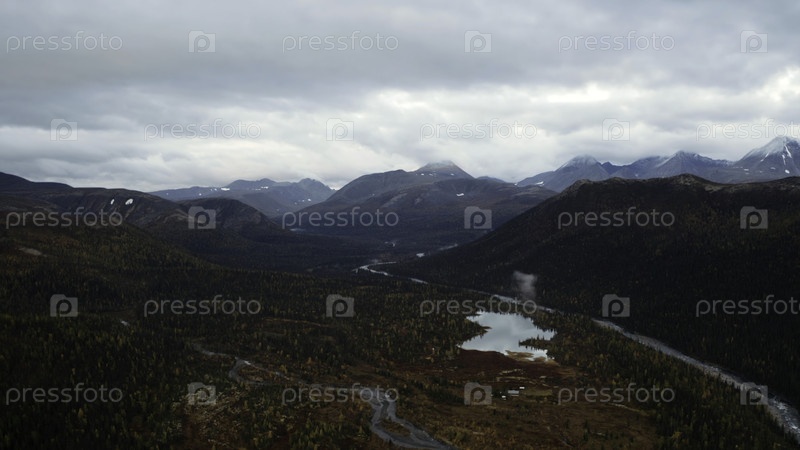 Воздушный полет над удивительным маленьким озером, окруженным лесистой долиной и горами. Клип. Нетронутая природа сверху в поздний осенний день