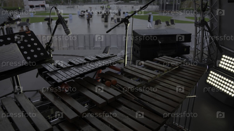 Живая музыкальная установка на открытом воздухе с ксилофоном в дождливой и спокойной атмосфере
