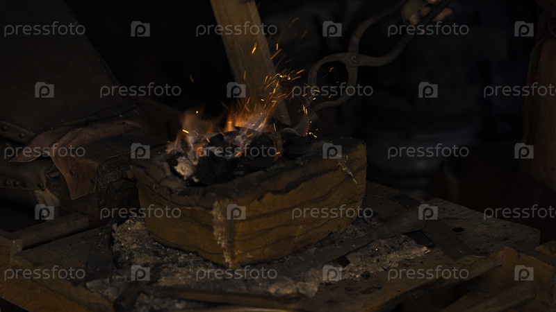 Нагретый котел для работы с кованым железом. СМИ. Горящий и нагревающий котель, чтобы облегчить деформацию железа