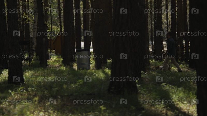 Прекрасный вид на лес и мужчина, гуляющий с собакой. Скриншоты. Мужчина ходит со своей собакой по поводу в лесу в солнечный летний день. Мужчины прогуливаются с терьером Джеком Расселом в парке