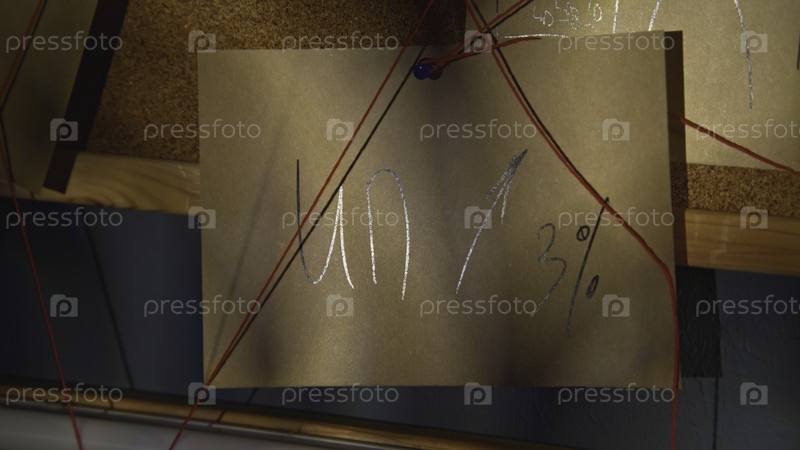 Записки с красной нитью. Скриншоты. Близкий план таинственных нот, соединенных красной нитью. Символы и головоломки на загадочной доске с нитями