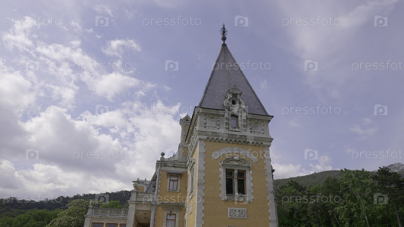 Прекрасный вид на древнюю архитектуру дворца. Действие. Красивая архитектура дворца в европейском стиле на фоне зеленого леса. Европейский дворец в зеленых горах летом