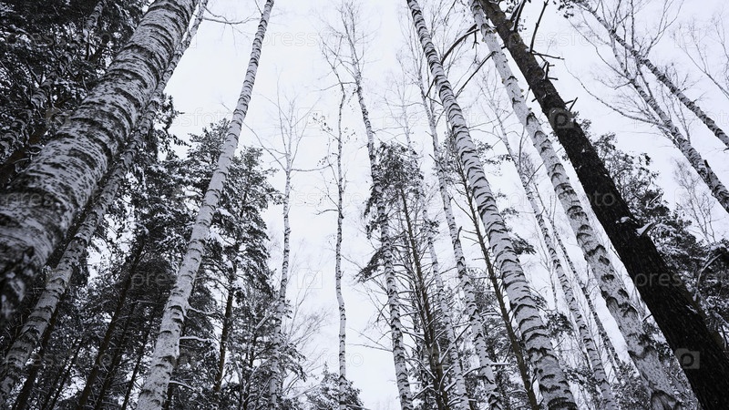 Снежные зимние склоны и лес березовых деревьев.СМИ. Прекрасный зимний пейзаж, спокойный день в лесу