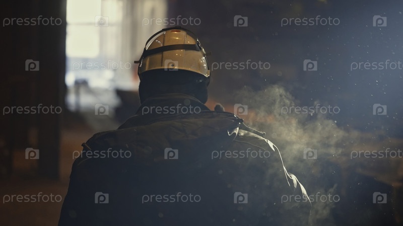 Работник вдыхает дым на фабрике. Скриншоты. Рабочий в костюме выдыхает пар на металлургическом заводе. Работник выдыхает дым или пар на горячем заводском полу