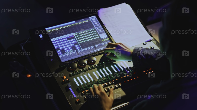 Смешивание аудиооборудования. Медиа. Звуковой инженер и световой инженер управляют современной консолью. Управление светом и звуком с консоли на современную производительность
