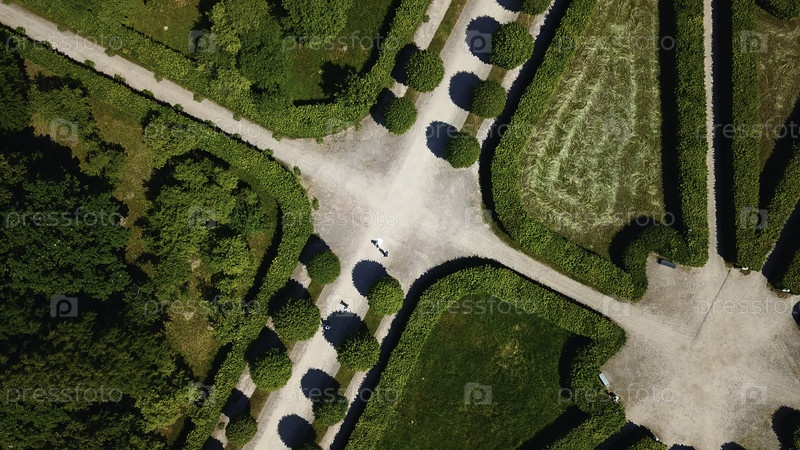 Вид сверху людей, идущих по геометрическим садовым тропинкам. Креативное. Красивые узоры дворцового сада в солнечный летний день. Территория дворцового сада с красивыми дорожками и лабиринтами