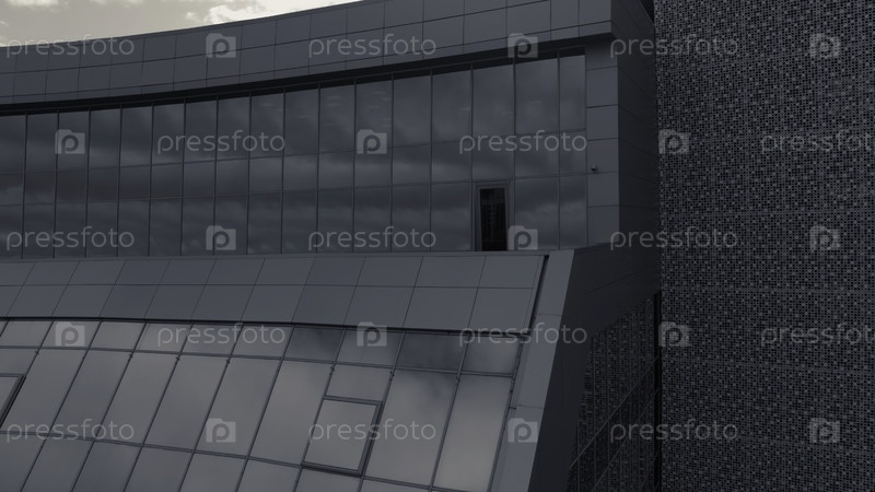 Огромное черное здание, новейшее здание с огромными черными окнами на белом небе