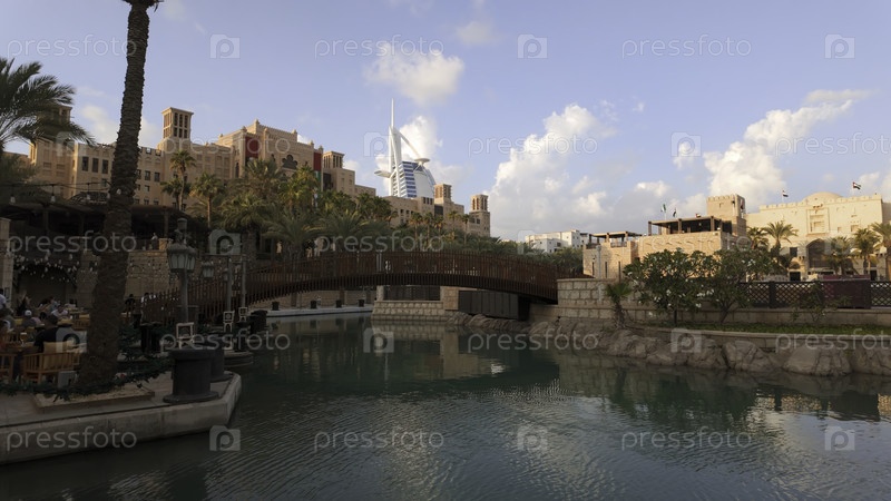 Дубай - ОАЭ, 3 января 2024: Вид на канал Дубая с бирюзовой водой. Действие. Туристы в ресторане и виллы на заднем плане