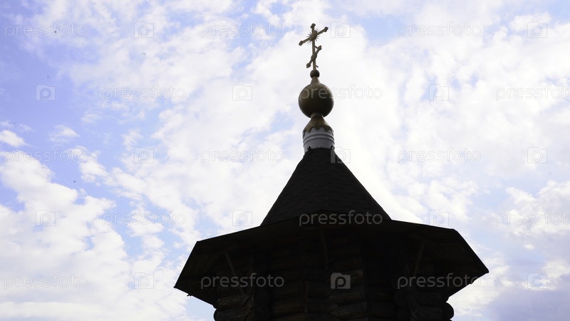 Древняя деревянная башня церкви. СМИ. Деревянная башня древней церкви на фоне неба. Архитектура деревянной церкви с крестом в пасмурный день