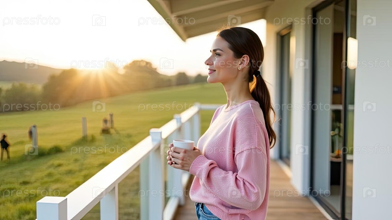 Кавказская женщина в розовом свитере стоит на веранде, держит чайную кружку, весенний восход солнца дома