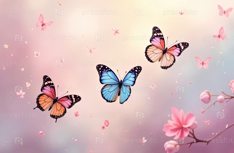 Бабочки и вишневые цветки, пастельно-розовый фон, цветочный воздушный горизонтальный для радостных весенних проектов