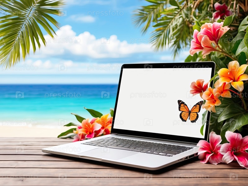 Рабочее место фрилансера на открытом воздухе, ноутбук, тропический летний пляж, копировальное пространство на столе для бизнес-текста или логотипа