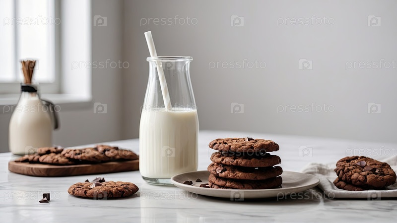 Бутылка молочных и шоколадных печенья на подносе, включает растительные, миндальные, овсяные, рисовые и традиционное молоко, идею питательной закуски