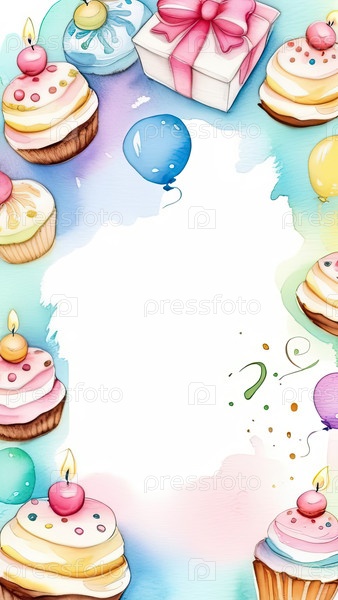 Вертикальный пастельный шарик и граница кексов, праздничная рамка акварели, поздравительная открытка или текстовая область приглашения