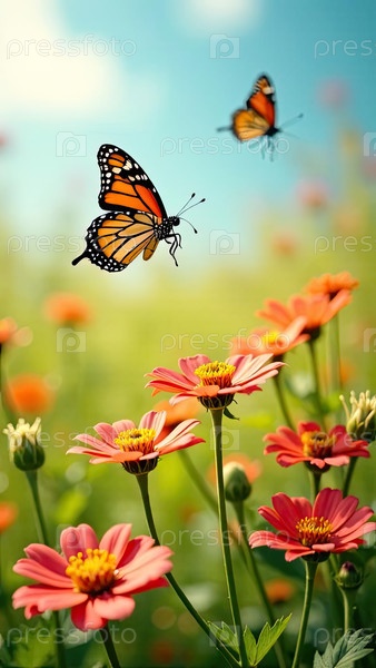 Бабочка на розовых диких цветах, фон природы весной, позитивный веселый вертикальный шаблон