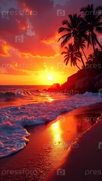 Вертикальный светящийся закаты солнца тропический пляж, отраженные облака, пальмы, романтический фон отдыха для плакатов или открыток