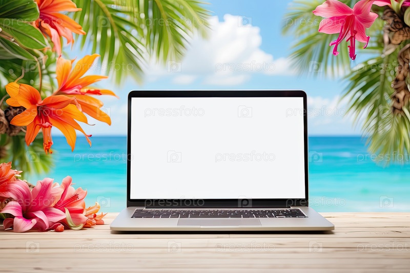Минималистская дистанционная рабочая сцена: ноутбук, летний пляж, пальмовые тени, цветы, большая площадь для копирования, сообщения, предложения или рекламы