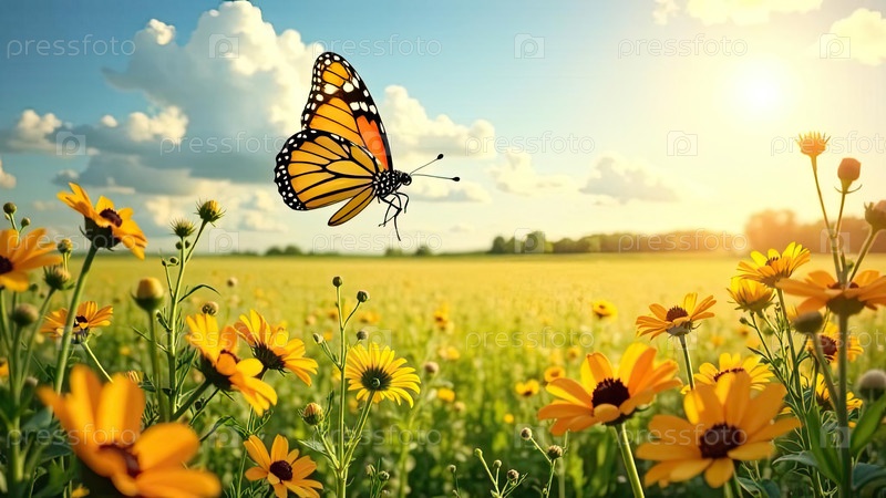 Солнечный фон природы, поле диких цветов с бабочками, шаблон широкого света, летние цветки для цифрового дизайна