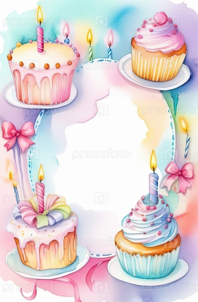 Пастельная рамка границы торта на день рождения, акварельный дизайн со свечами, шаблон поздравительной карточки, копирование пространства для пожеланий