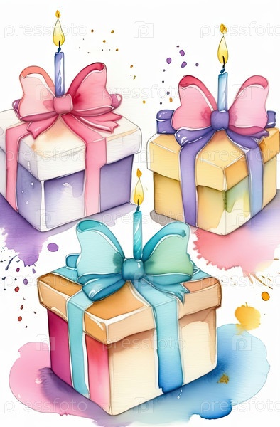 Куча пастельных акварельных подарков, праздничный рисунок на день рождения, луки и праздничный фон, пространство для текста