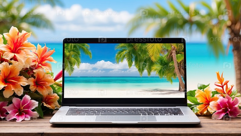 Удаленная работа на тропическом пляже, ноутбук с цветами, копировальное пространство для летней рекламы или сообщения фрилансера