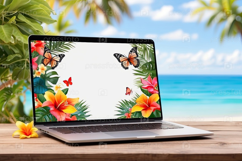 Ноутбук для удаленной работы установлен на летней террасе, плумерии, пальме, голубом море, копировальном пространстве (отпускный офис и место фрилансеров)